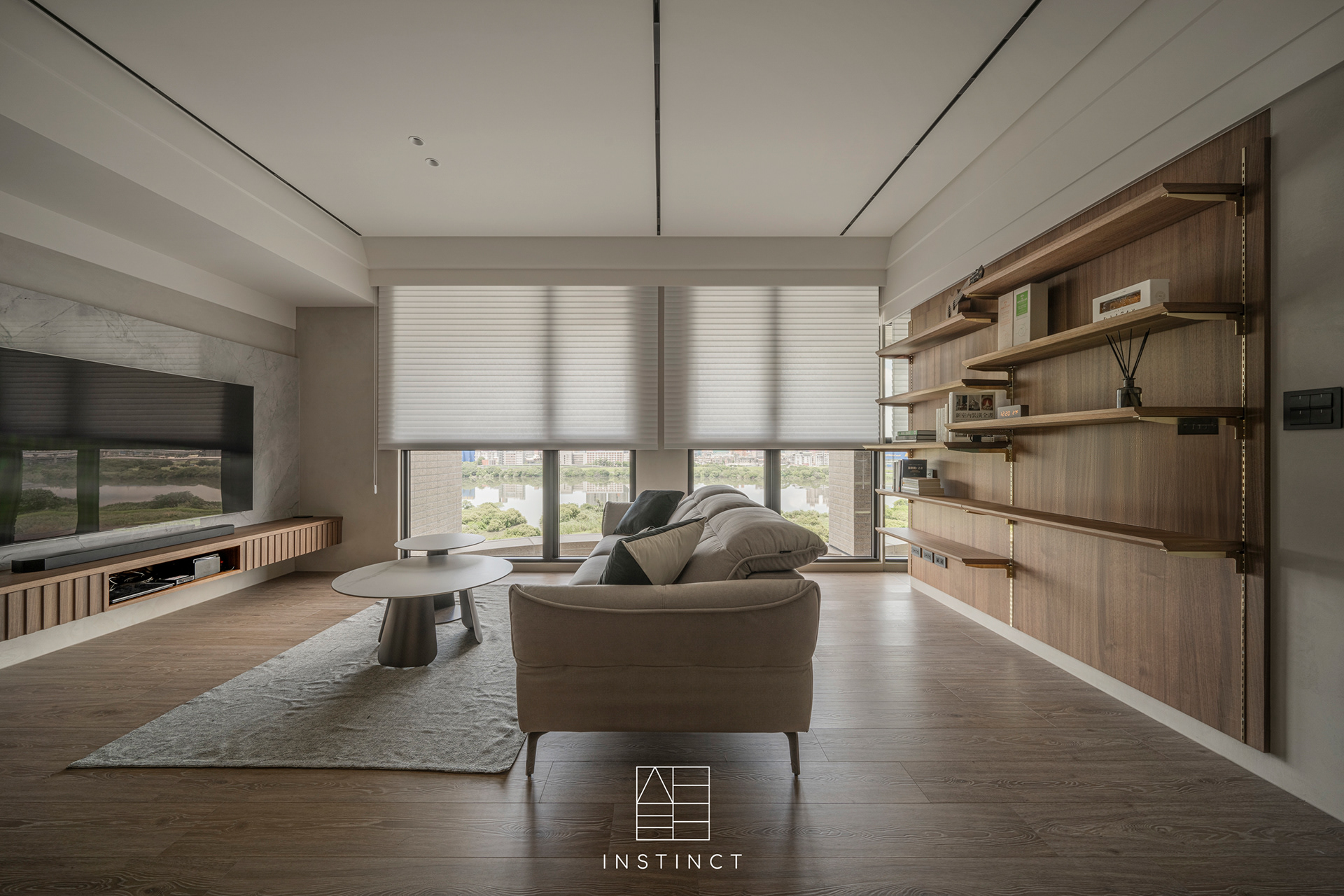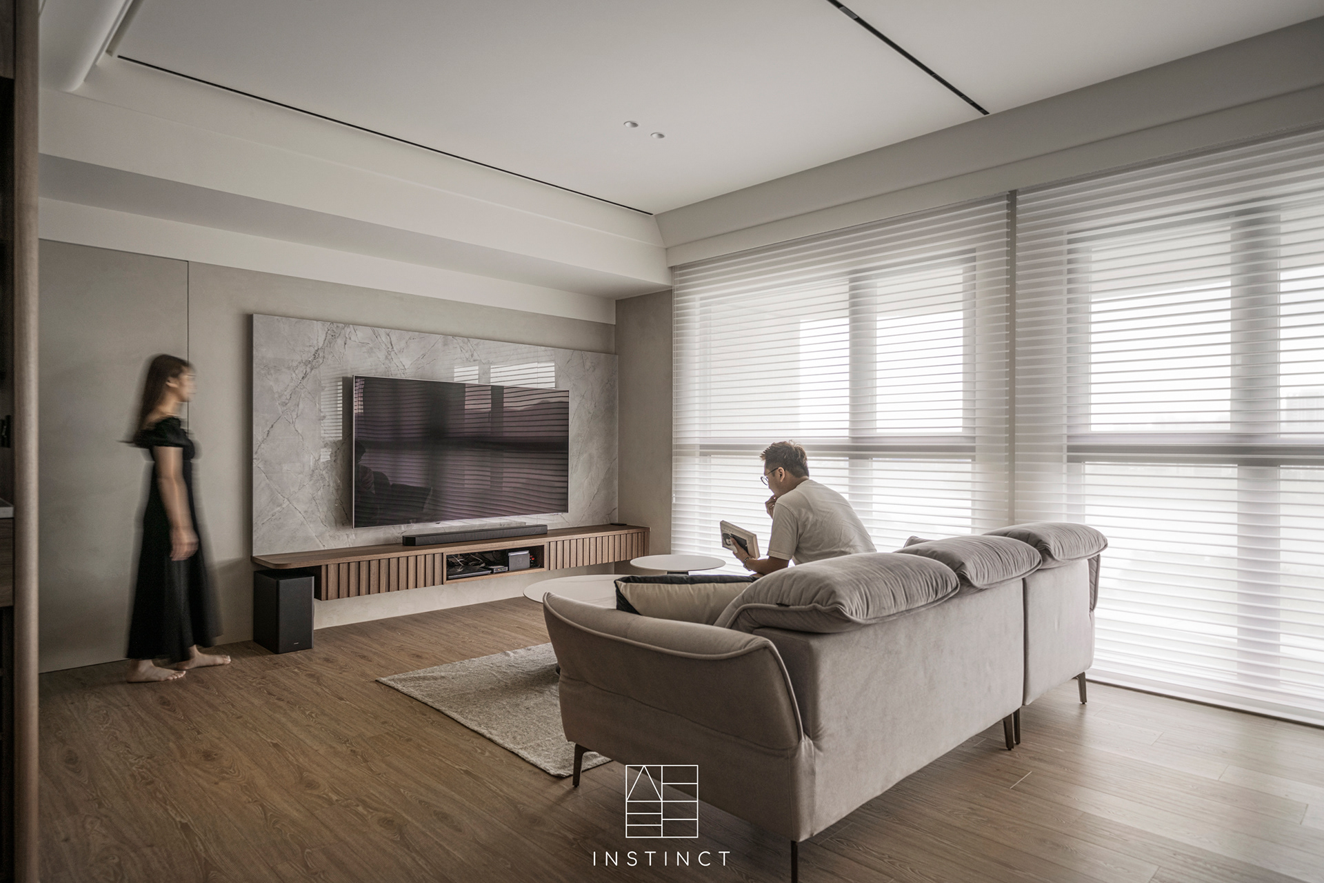 入口玄關造型牆做為過渡,既區隔也穿透,進而轉換到客餐廳與主臥。室內以藝術漆刷出的質感紋理豐富空間層次,延續年輕夫妻業主喜愛的風格。透過書牆和酒櫃規劃展示品味收藏,整體以低調藕灰色做為基礎,金色細節與石材紋理點綴打造年輕專業人士的內斂現代時髦生活感。